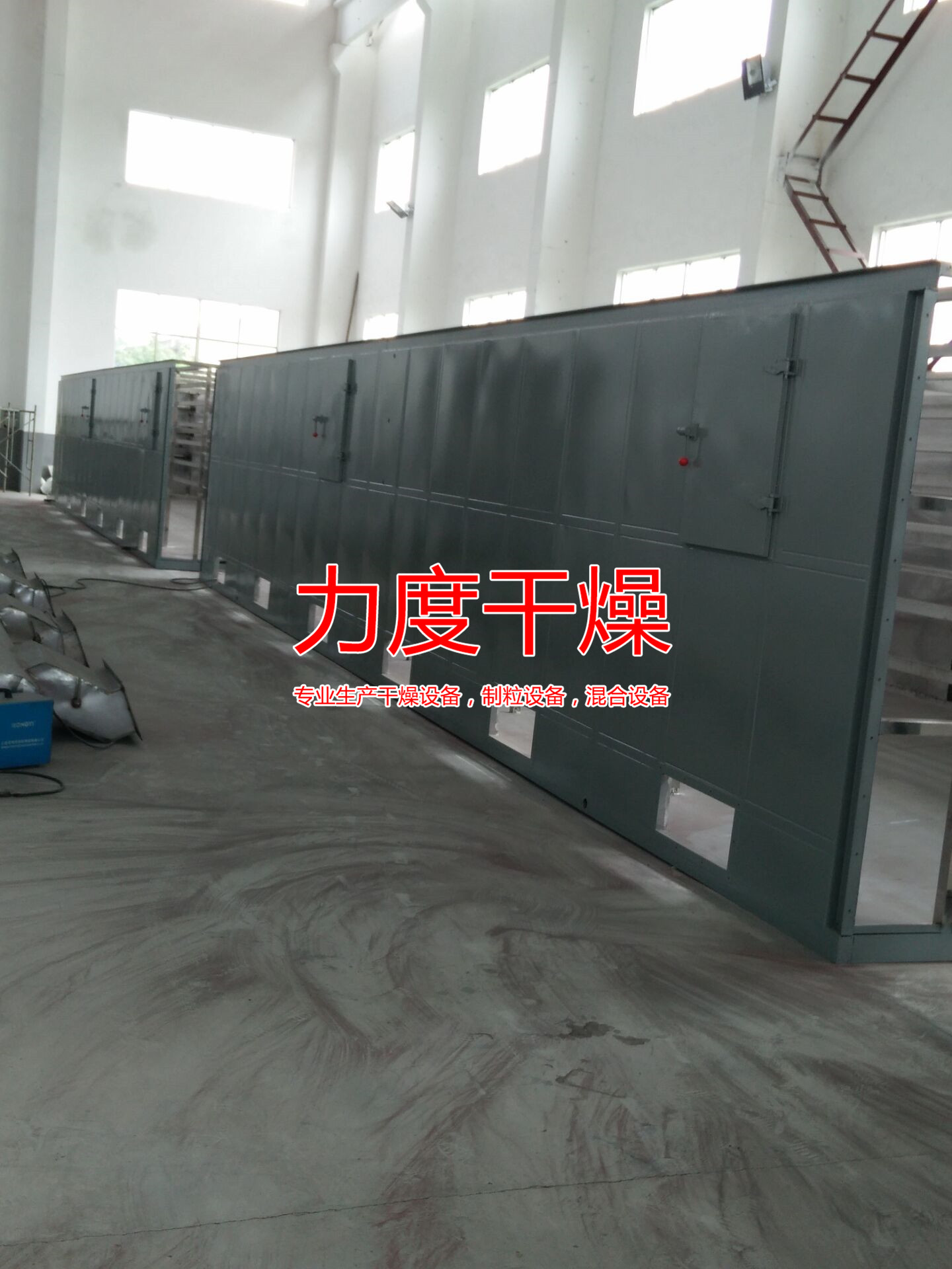 物料通過定制的自動擺料器均勻地鋪在網帶上,網帶一般采用12-60目不銹鋼絲網,由傳動裝置拖動在干燥機內移動。干燥機由若干單元組成,每一單元熱風獨立循環,部分尾氣由專門排濕風機排出,廢氣由調節閥控制,熱氣由下往上或由上往下穿過鋪滿物料的網帶完成熱量與質量傳遞的進程,帶走物料水份。網帶緩慢移動,運行速度可根據物料溫度自由調節,干燥后的成品連續落入收料器中。上下循環單元根據用戶需要可靈活配備,單元數量亦可根據需要選取。