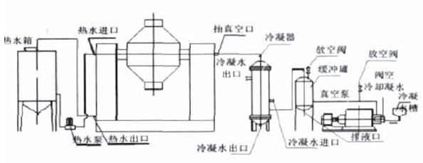 雙錐回轉(zhuǎn)真空干燥機(jī)系統(tǒng)由主機(jī)、冷凝器、緩沖罐、真空抽氣系統(tǒng)、加熱系統(tǒng)與控制系統(tǒng)等組成。就主機(jī)而言,由回轉(zhuǎn)筒體、真空抽氣管路、左右回轉(zhuǎn)軸、傳動裝置與機(jī)架等組成。