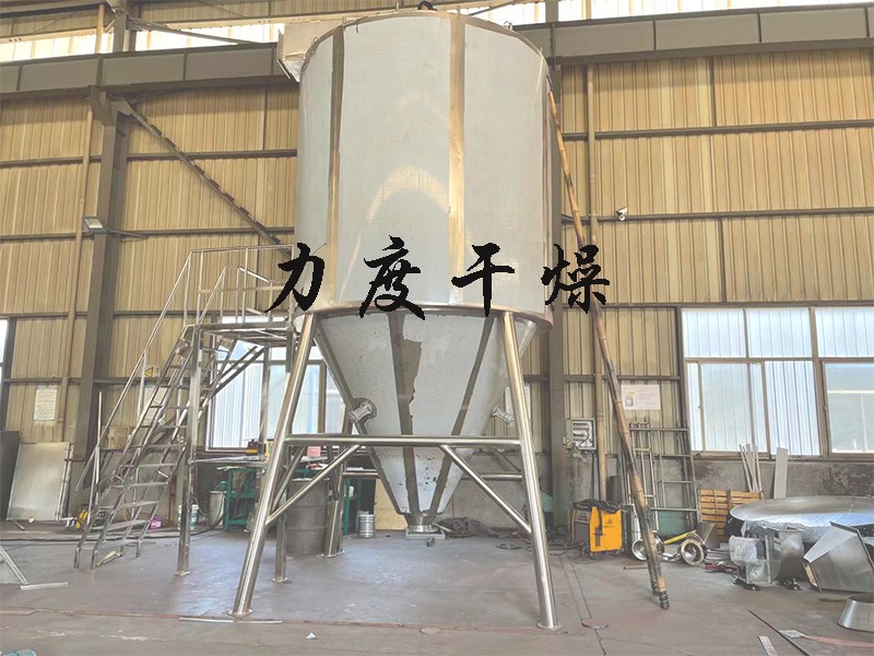 空氣通過過濾器和加熱裝置后,進入干燥室頂部的進風分配器,通過進風分配器的熱空氣呈螺旋狀均勻地進入塔內(nèi),同時由螺桿泵將料液送到裝在塔體頂部的離心噴霧頭,料液被霧化成極小的霧狀液滴,使料液和熱空氣接觸的表面積大大增加,小液滴和熱風并流下沉,水份迅速蒸發(fā)在極短的時間內(nèi)被干燥為粉粒制品,在塔底和旋風分離器中捕集,廢氣排至外界。