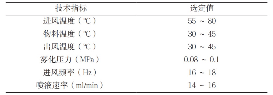 分別以糊精、甘露醇、微晶纖維素、乳糖和可溶性淀粉為單一制粒輔料,稱取重量均為 800 g,分別以純化水、5 % PVP-K30、5 %HPMC 作為粘合劑進(jìn)行流化床制粒,粘合劑用量均為700 ml,流化床操作技術(shù)參數(shù)見表1。成粒后繼續(xù)干燥,水分控制在 3 % 以下,過 20 目篩網(wǎng)整粒,取出備用。