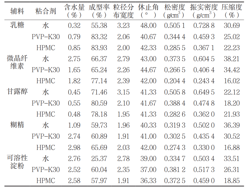 流化床制粒技術(shù)因集混合、制粒、干燥于一體,在中藥浸膏粉制粒中應(yīng)用廣泛。本研究針對5種藥用輔料(糊精、甘露醇、微晶纖維素、乳糖、可溶性淀粉),分別以純化水、5% PVP-K30、5% HPMC為粘合劑進(jìn)行流化床制粒,通過分析7項(xiàng)物性指標(biāo)(含水量、成型率、粒徑分布寬度、休止角、松密度、振實(shí)密度、壓縮度),探究輔料及粘合劑對顆粒質(zhì)量的影響,為中藥浸膏粉輔料篩選提供依據(jù)。