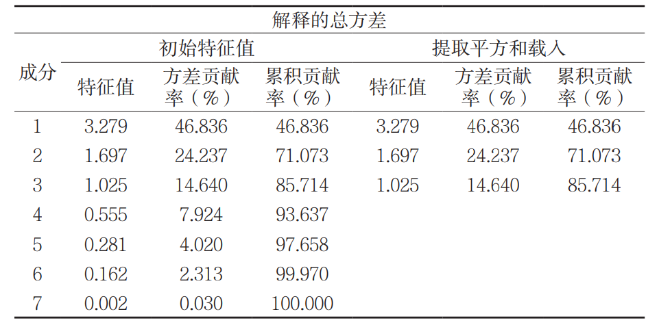 對不同輔料制成的 15 種顆粒 7 項(xiàng)物性指標(biāo)原始數(shù)值經(jīng)標(biāo)準(zhǔn)化處理后進(jìn)行主成分分析。由表4 可知,初始特征值大于 1 的主成分有三個(gè),且這三個(gè)主成分的方差貢獻(xiàn)率之和在 85 % 以上,即代表性較大,其余成分的初始特征值均趨于平坦且數(shù)值小于 1,即代表性較小。顆粒物性指標(biāo)前三個(gè)主成分的方差貢獻(xiàn)率分別為 46.645 %、24.237 %、14.640 %,累積方差貢獻(xiàn)率為 85.714%,也可看出三個(gè)主成分具有顯著代表性。