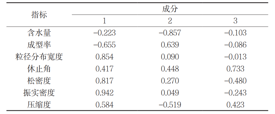 顆粒物性指標(biāo)的主成分載荷矩陣結(jié)果見表5,可反映各主成分對顆粒物性指標(biāo)的影響程度。由表5 可知,對di一主成分產(chǎn)生正向影響的物性指標(biāo)有粒徑分布寬度、振實(shí)密度、松密度和壓縮度。其中,振實(shí)密度的載荷數(shù)zui大,數(shù)值為 0.942,其次為粒徑分布寬度,數(shù)值為 0.854。成型率的載荷數(shù)較高,但對di一主成分產(chǎn)生負(fù)向影響。由表 3 可知,粒徑分布寬度與松密度和振實(shí)密度呈極顯著正相關(guān),與成型率呈顯著負(fù)相關(guān),松密度與振實(shí)度呈極顯著正相關(guān),振實(shí)密度與壓縮度呈顯著正相關(guān),即粒徑分布寬度的變化,均可直接或間接影響成型率、松密度、振實(shí)密度和壓縮度,因此將粒徑分布寬度作為di一主成分的代表指標(biāo)。對第二主成分產(chǎn)生負(fù)向影響的物性指標(biāo)有含水量和壓縮度,對第二主成分負(fù)向影響zui大的是含水量,載荷數(shù)為 -0.857。第二主成分正向影響中,以成型率的載荷數(shù)zui大,載荷數(shù)為 0.639,其次是休止角。第二主成分大時(shí),成型率和休止角會(huì)相應(yīng)增大,而含水量和壓縮度這兩個(gè)指標(biāo)值會(huì)減小。第三主成分正向影響的指標(biāo)有休止角和壓縮度,以休止角的載荷數(shù)zui大,載荷數(shù)為 0.733。對第三主成分產(chǎn)生負(fù)向影響的物性指標(biāo)中,負(fù)向影響zui大的是松密度和振實(shí)密度,以松密度的載荷數(shù)zui大,載荷數(shù)為 -0.480。第三主成分大時(shí),休止角和壓縮度會(huì)相應(yīng)增大,而松密度和振實(shí)密度這兩個(gè)指標(biāo)值會(huì)減小。