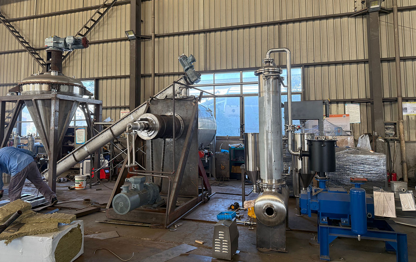 真空干燥單元:由耙式真空干燥機(jī)、導(dǎo)熱油爐、真空泵及真空管路組成,通過(guò) “真空降沸點(diǎn) + 導(dǎo)熱油供熱” 實(shí)現(xiàn)物料低溫干燥。