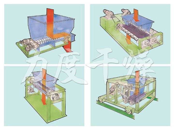 ◎槽形成型機: 由加料斗和刻有槽的二根輥子構成。以增大物料表面積的造粒為目的。物料被內側運轉的輥子吸入,被反轉的外側刮刀切成粒狀。