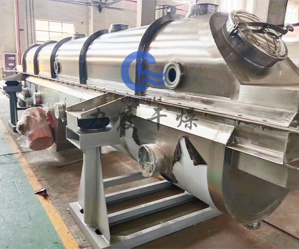 物料自進料口進入機內,在振動力作用下,物料沿水平方向拋擲向前連續運動,熱風向上穿過流化床同濕物料換熱后,濕空氣經旋風分離器(或脈沖式布袋除塵器)除塵后由排風排出,干燥物料由排料口排出,然后收集包裝。