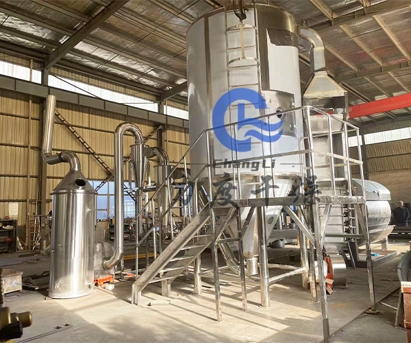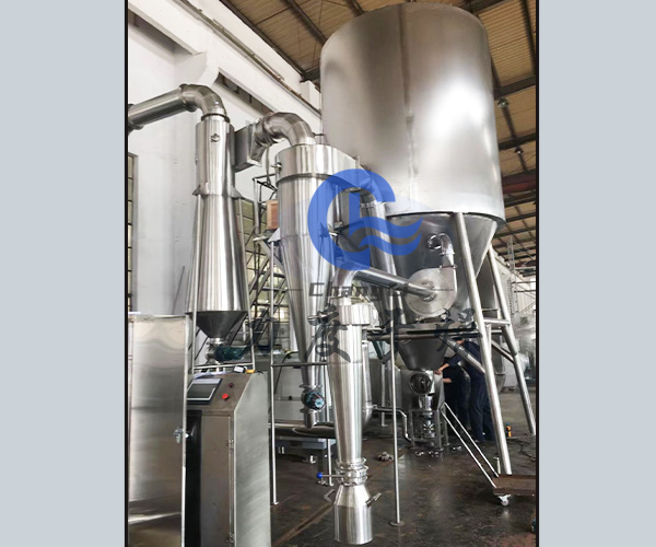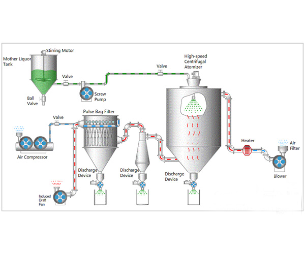 空氣經過濾和加熱,進入干燥器頂部空氣分配器,熱空氣呈螺旋狀均勻地進入干燥室。料液經塔體頂部的高速離心霧化器,(旋轉)噴霧成極細微的霧狀液珠,與熱空氣并流接觸在極短的時間內可干燥為成品。成品連續地由干燥塔底部和旋風分離器中輸出,廢氣由風機排空。