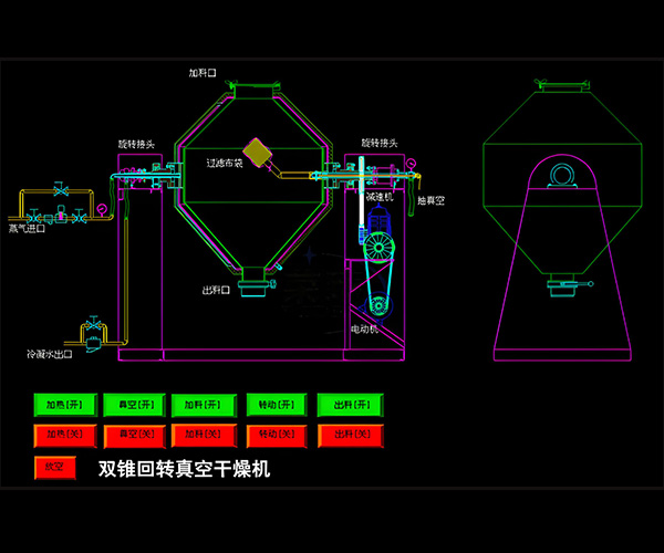 雙錐回轉真空干燥機為雙錐形的回轉罐體,罐內在真空狀態下,向夾套內通入蒸汽或熱水進行加熱,熱量通過罐體內壁與濕物料接觸,濕物料吸熱后蒸發的水汽,通過真空泵經真空排氣管被抽走。由于罐體內處于真空狀態,且罐體的回轉使物料不斷的上下內外翻動,故加快了物料的干燥速度,提高干燥效率,達到均勻干燥的目的。雙錐回轉真空干燥機系統主要由雙錐回轉真空干燥機、冷凝器、除塵器、真空抽氣系統、加熱系統、冷卻系統、電控系統等組成。