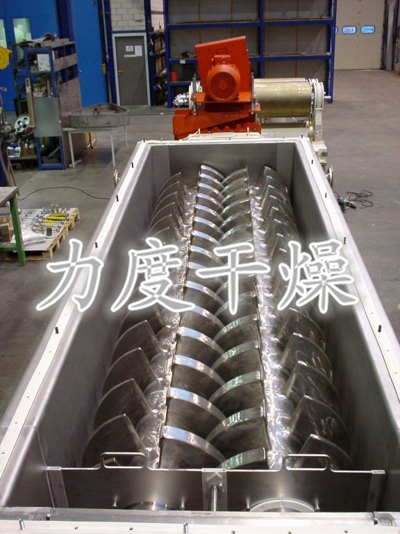 空心軸上密集排列著楔型中空漿葉,熱介質經空心軸流經漿葉。單位有效容積內傳熱面積很大,熱介質溫度從-40℃到320℃,可以是水蒸汽,也可以是液體型:如熱水、導熱油等。間接傳導加熱,沒有攜帶空氣帶走熱量,熱量均用來加熱物料。熱量損失僅為通過器體保溫層向環境的散熱。楔型漿葉傳熱面具有自清潔功能。物料顆粒與楔型面的相對運動產生洗刷作用,能夠洗刷掉楔型面上附著物料,使運轉中一直保持著清潔的傳熱面。漿葉干燥機的殼體為Ω型,殼體內一般安排二到四根空心攪拌軸。殼體有密封端蓋與上蓋,防止物料粉塵外泄而充分發揮作用。